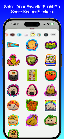 This fun and original Sushi Go Score Keeper sticker pack, based on the Sushi Go Score Keeper App, lets you have some extra fun and express yourself in